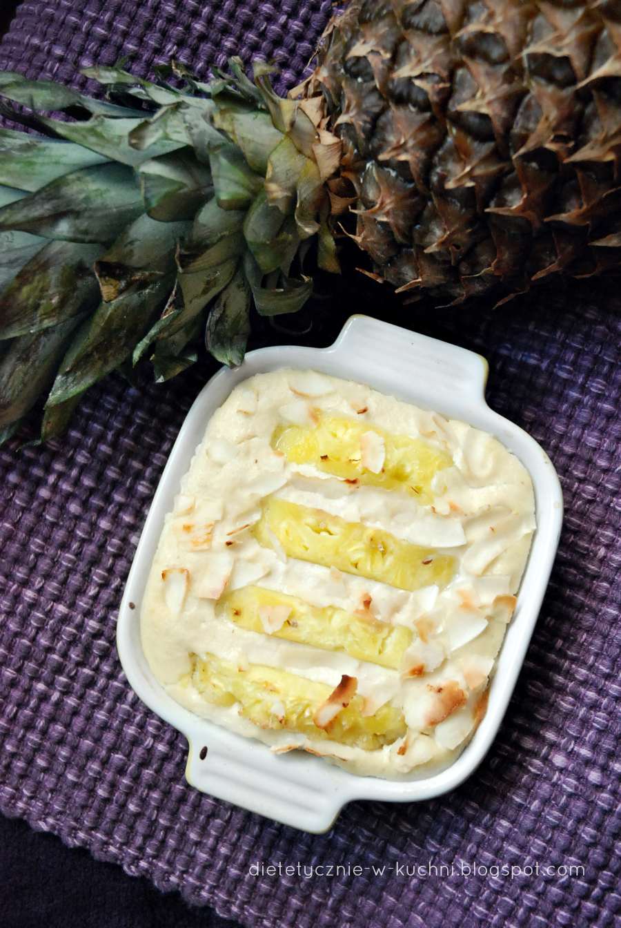 Nachodzi mnie czasem ochota, żeby kupić w sklepie ładnego, dojrzałego ananasa, pokroić go sobie w kostkę i podjadać przy komputerze. Czasem wydaje mi się, że mam większą słabość do owoców niż do słodyczy 🙂 Właśnie wczoraj przyszło mi do głowy, że chyba napiszę niebawem mały elaborat o owocach, bo ostatnimi czasy dochodzę do wniosku, że to kolejny kontrowersyjny temat jeżeli o produkty spożywcze chodzi - jeść czy nie jeść? W jakiej ilości, do której godziny i dlaczego? Co z fruktozą? Wiele kwestii do poruszenia, myślę, że będzie to ciekawy temat. Wracając jednak do ogromnego, soczystego ananasa, którego za całe 2,5zł zdobyłam w sklepie na dole ledwo powstrzymując się od kupna od razu 3 - nie byłam jednak wstanie zjeść go całego sama, więc zużyłam część do nowej wersji serniczka śniadaniowego - przed Wami pina colada!