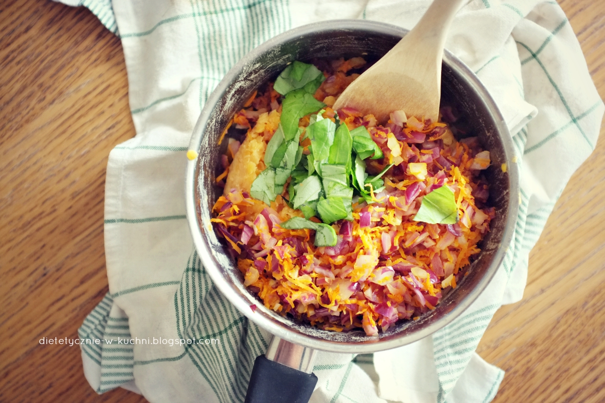 Cebulę drobno siekamy, a marchew ucieramy na małych oczkach tarki, składniki dusimy do miękkości na delikatnie natłuszczonej patelni (po podsmażeniu podlewamy wodą, dusimy i odparowujemy).